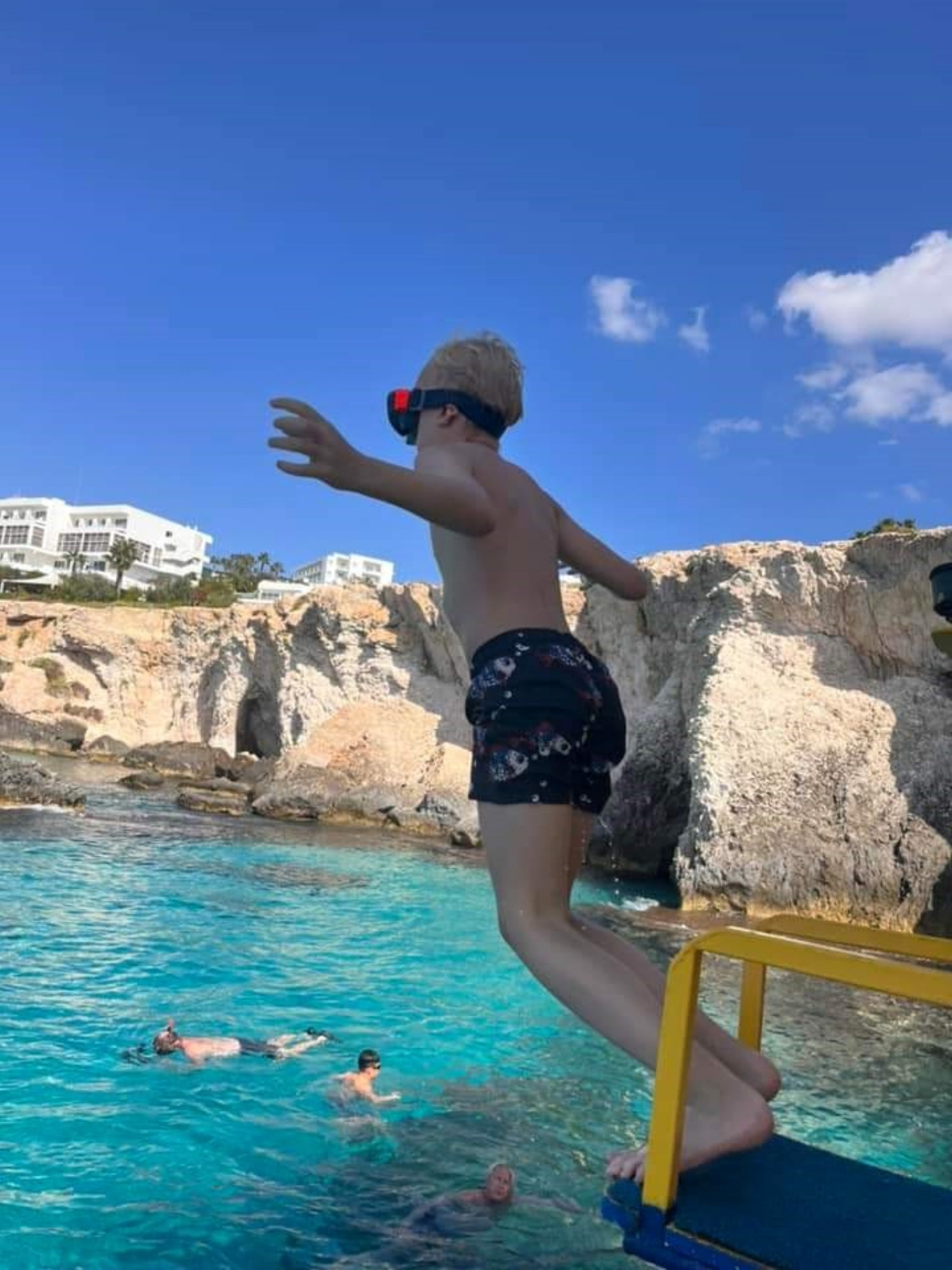 Starting from ayia napa harbour we cruise along the coastline giving everybody the opportunity to go and discover our portholes in the underwater viewing deck, once at the sea caves we have our diver that dives down and feeds the fish so everyone can see this, next is our swim stop. Our captain and crew will guide you swimming around the sea caves, there are 4 caves that you can swim through, after this we still have plenty of time to use our waterslide and our 3 different diving boards.